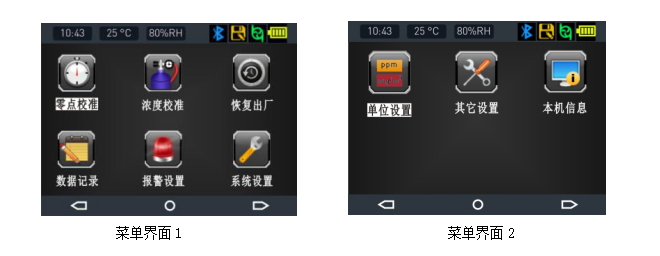 ●2.31英寸高清彩屏顯示實(shí)時(shí)濃度、報(bào)警、時(shí)間、溫度、濕度、存儲(chǔ)、通信、電量、 充電狀態(tài)等信息,菜單界面采用高清仿真圖標(biāo)顯示各個(gè)菜單的功能名稱(chēng)