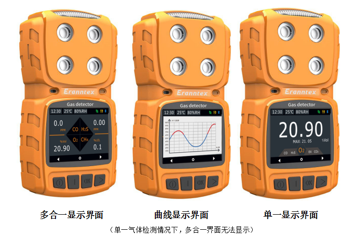 ●三種顯示模式可切換:同時(shí)顯示四種氣體濃度、大字體循環(huán)顯示單通道氣體的濃度、實(shí)時(shí)曲線,各通道之間自動(dòng)循環(huán)或手動(dòng)循環(huán)可切換,可設(shè)置是否顯示最大值、最小值、氣體名稱(chēng),可查看歷史記錄。