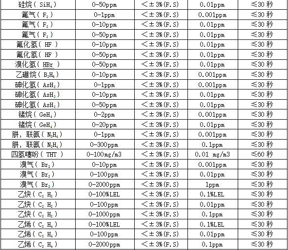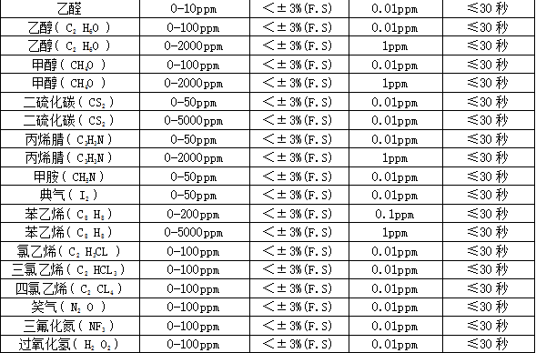 部分可檢測氣體列表: