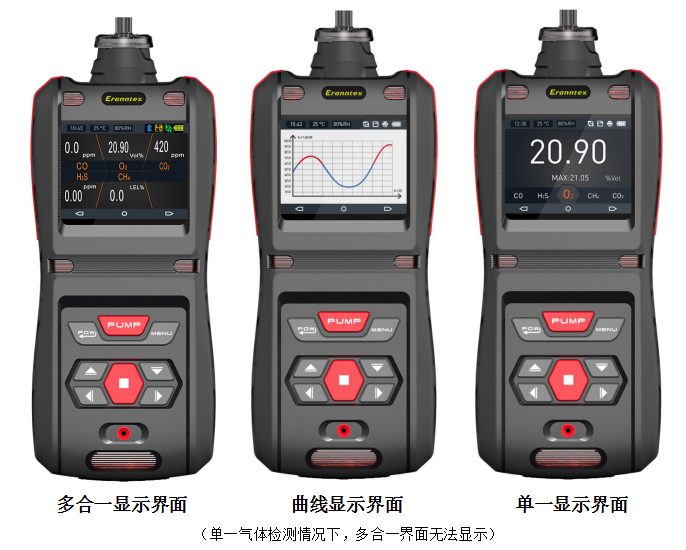 ●可以同時檢測1~5種氣體,單位自由切換,常規(guī)氣體不需要輸入分子量,特殊氣體需要輸入分子量就自動計算并切換,單位可選:PPM、mg/m3、Vol%、LEL%、PPHM、ppb、mg/L