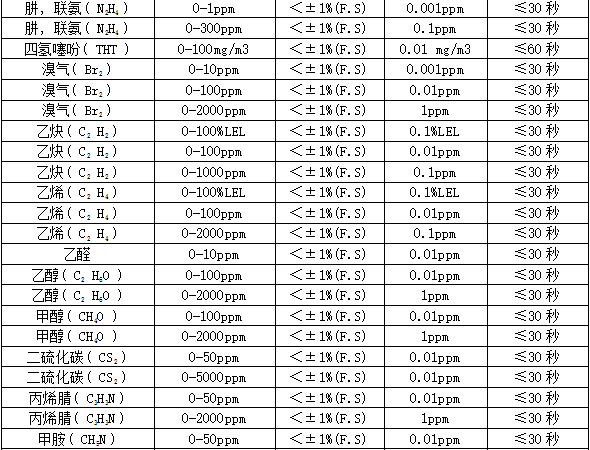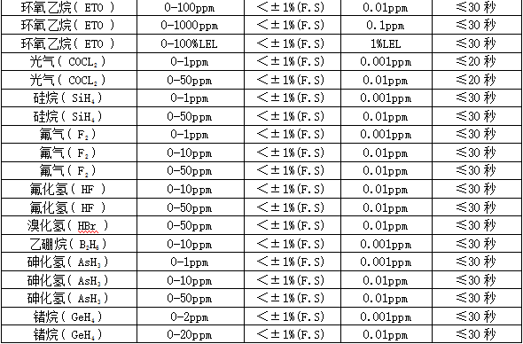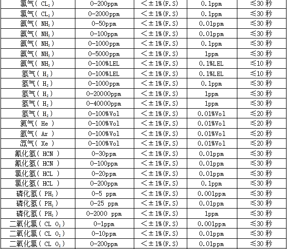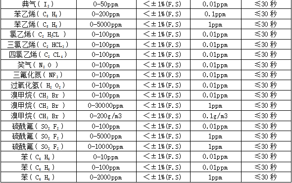部分可檢測(cè)氣體列表: